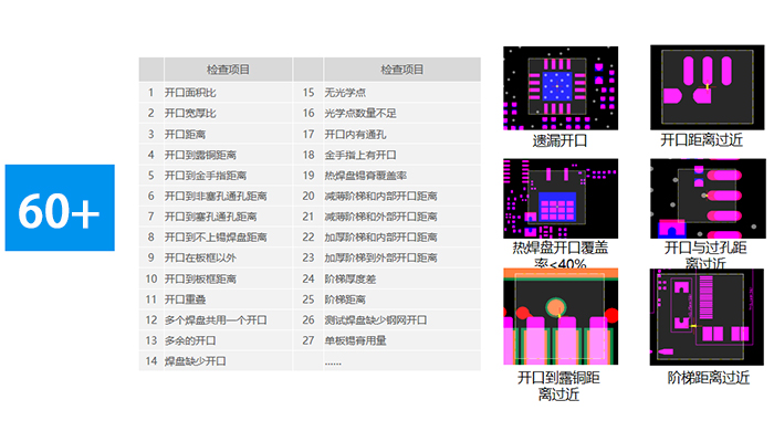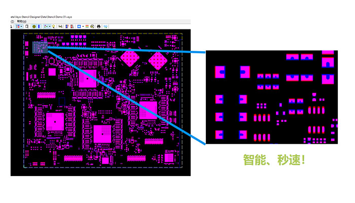 該軟件主要有三個作用,1、快速智能學習,構建數字化鋼網庫,形成企業內部鋼網規范;2、智能快速設計鋼網,減少鋼網修改周期,提升設計水平;3、鋼網檢查,快速檢查設計疏漏和設計規范性。今天要探討的主要是其第三個作用,即快速鋼網檢查。